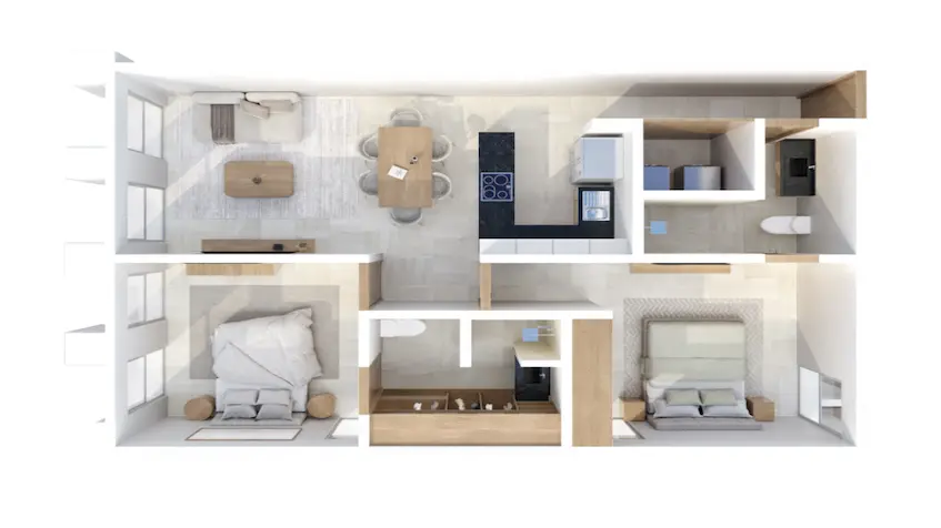 • Modelo B2 (2 Recámaras): 62 m², sala, comedor, cocina, área de lavado, 2 baños completos, recámara principal con baño vestidor.