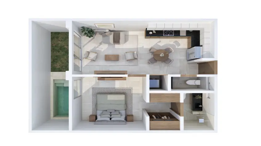 • Modelo A (1 Recámara): 51 m², sala, comedor, cocina, área de lavado, baño completo, recámara principal con baño vestidor.